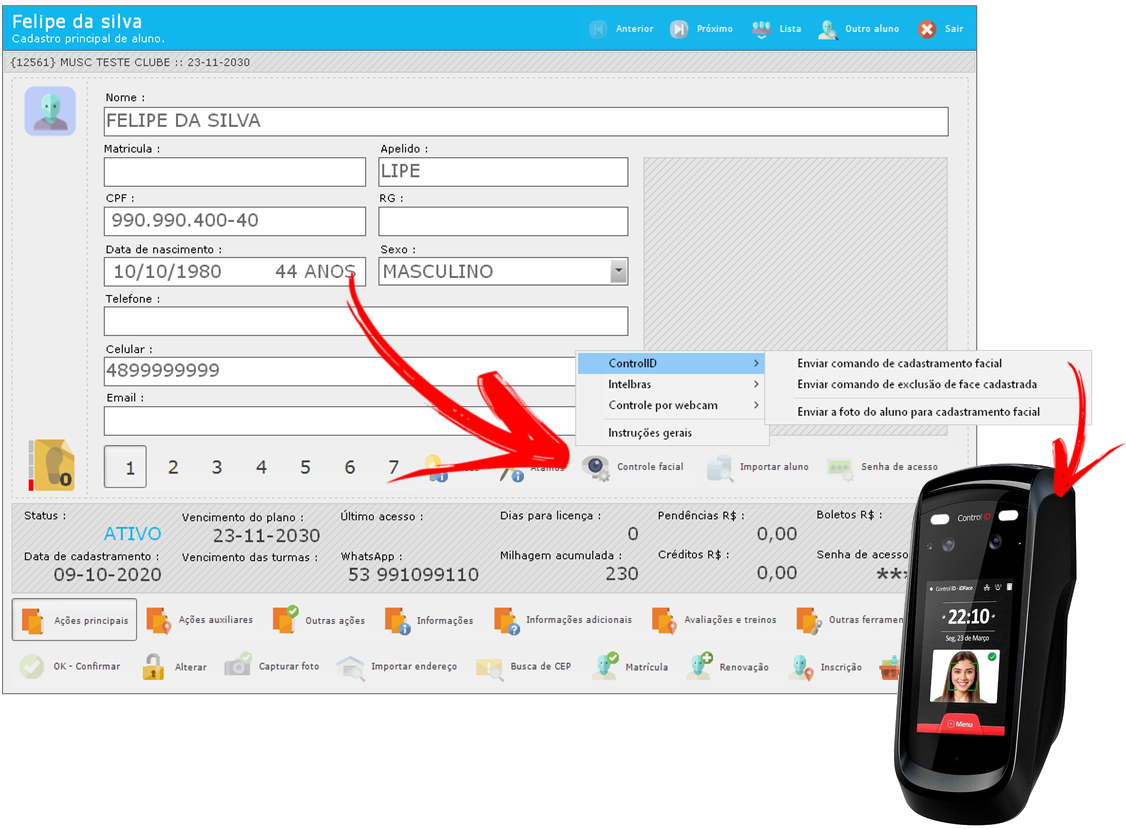 Caso o aluno ou usuário já possua foto no sistema, você pode usar o comando de cadastramento facial via foto. Essa opção envia diretamente a imagem cadastrada para o controlador facial, gerando um cadastro para ela. Mas atenção: sempre é melhor utilizar a captura da face pelo leitor facial, pois a qualidade é muito superior a fotos capturadas por câmeras de computador.